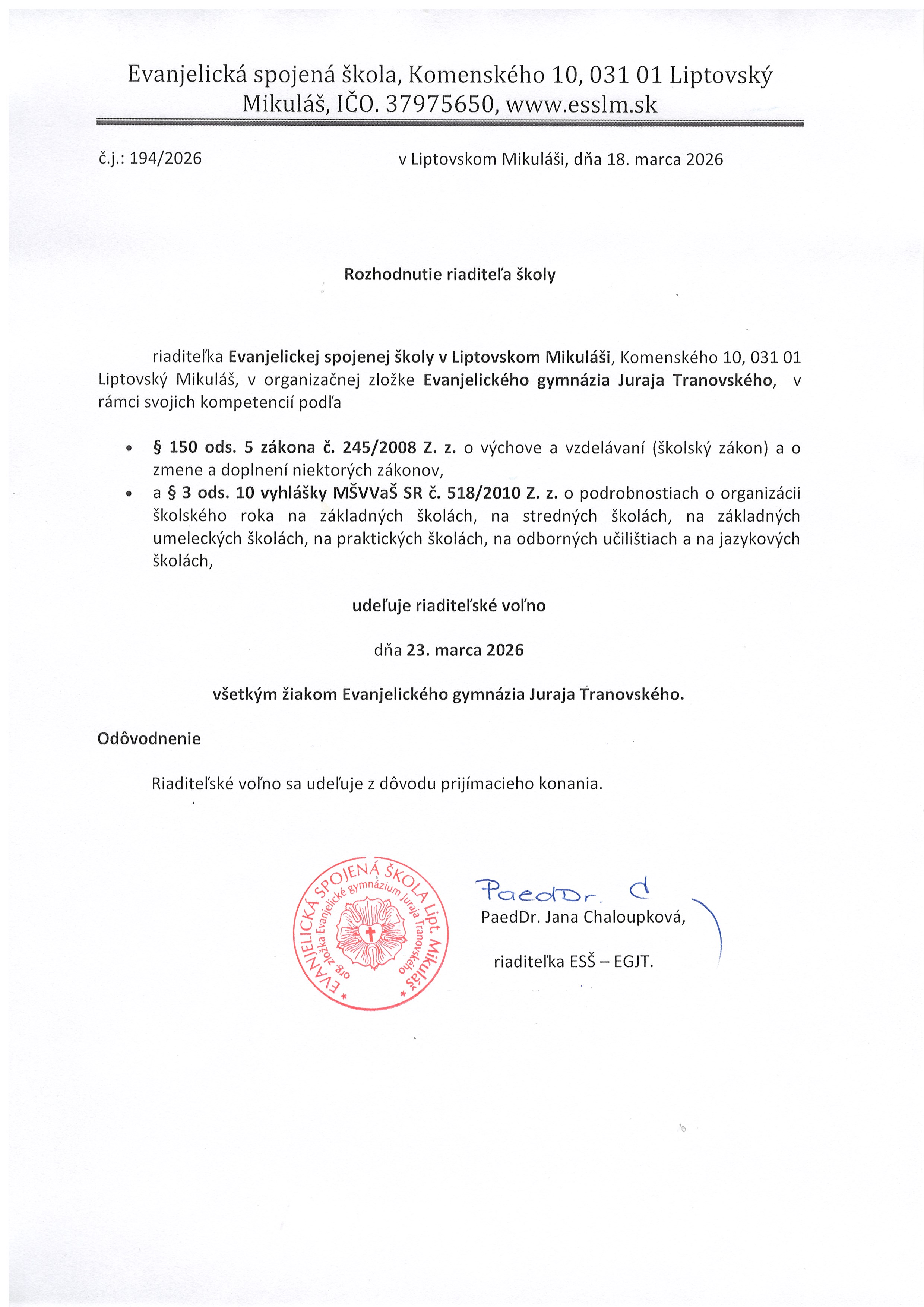 Riaditeľka Evanjelickej spojenej školy v Liptovskom Mikuláši, Komenského 10, 031 01 Liptovský Mikuláš, v organizačnej zložke Evanjelického gymnázia Juraja Tranovského, v rámci svojich kompetencií podľa